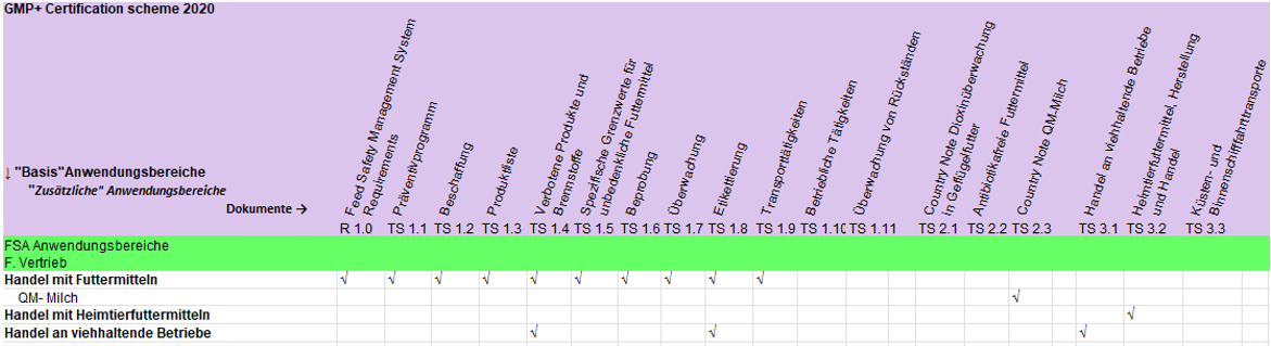 Für jeden GMP+-Anwendungsbereich für die Zertifizierung gelten Systemdokumente (Feed Safety Management System Requirements und/oder Technical Specifications). In den nachstehenden Tabellen sehen Sie, welche Systemdokumente für jeden GMP+-Anwendungsbereich für die Zertifizierung gelten.