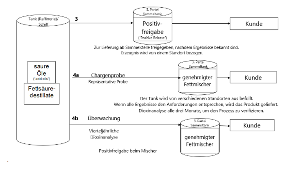 | 4b | Fettmischung: Verschiedene Hersteller (dabei kann es sich um verschiedene Herstellungsstandorte und/oder verschiedene rechtliche Einheiten handeln) liefern das Produkt an den Lagertank eines Dritten. Die Probenahme erfolgt in den Einrichtungen des Fettmischers, und zwar nach der Herstellung der Fettmischung. Jeder einzelne Hersteller muss alle Produkte, die an einen Lagertank von Dritten gesendet wurden, mittels einer quartalsmäßigen Probename (ergänzend zur vorgeschriebenen Überwachung) überwachen. Die einzelnen Hersteller sind verpflichtet, dem Fettmischer die Überwachungsergebnisse zur Verfügung zu stellen. | Diese Option ist obligatorisch, wenn es sich bei dem Fettprodukt um ein Mischfuttermittel handelt. Das Produkt kann eine einzige Fett- bzw. Ölart oder eine Mischung aus verschiedenen Fett- bzw. Ölprodukten sein. Das Produkt ist Eigentum des Fettmischers. Der Tank muss nicht notwendigerweise im selben Land wie der Herstellungsstandort sein. Der Hersteller muss die volle Kontrolle über die operativen Lagerungstätigkeiten haben oder muss eine Vereinbarung mit dem Lagerunternehmen haben, wenn ein Tank von einem Dritten verwendet wird. Der Fettmischer ist für die zusätzliche Überwachung pro Quartal verantwortlich. Die Erfassung von Herstellung, Transport und Lagerung muss deutlich sein und erschöpfend bilanziert werden. Die Datei mit den Analysezertifikaten muss vollständig und deutlich sein. Der Kunde muss in einem Analysebericht über die Analyseergebnisse informiert werden. |