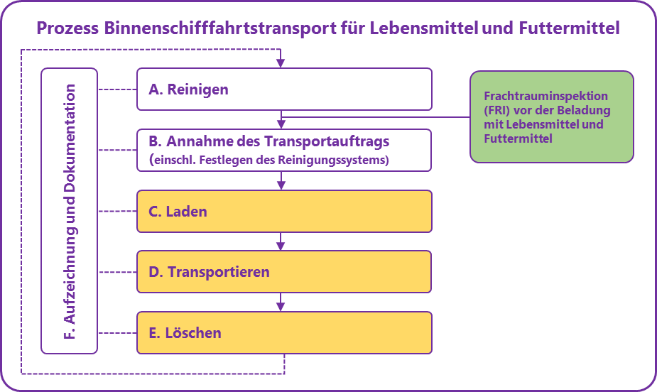Das Handbuch zum Hygienekodex für die Binnenschifffahrt basiert auf der Verwendung von Arbeitsplänen. Bei der Entwicklung dieser Arbeitspläne wurden drei Sorten Schiffe berücksichtigt: Tankschiffe (für hauptsächlich flüssige Ladung), Trockenfrachtschiffe und Containerschiffe. Es hängt von der Fracht ab, welcher Arbeitsplan angewendet werden muss. In den Arbeitsplänen wird ein Unterschied zwischen „Dedicated Transport“ und „Undedicated Transport“ gemacht. Mit „Dedicated Transport“ ist gemeint, dass das Schiff ausschließlich Lebensmittel oder Futtermittel transportiert. Beim „Dedicated Transport“ ist eine Reihe Gefahren von vornherein eliminiert.