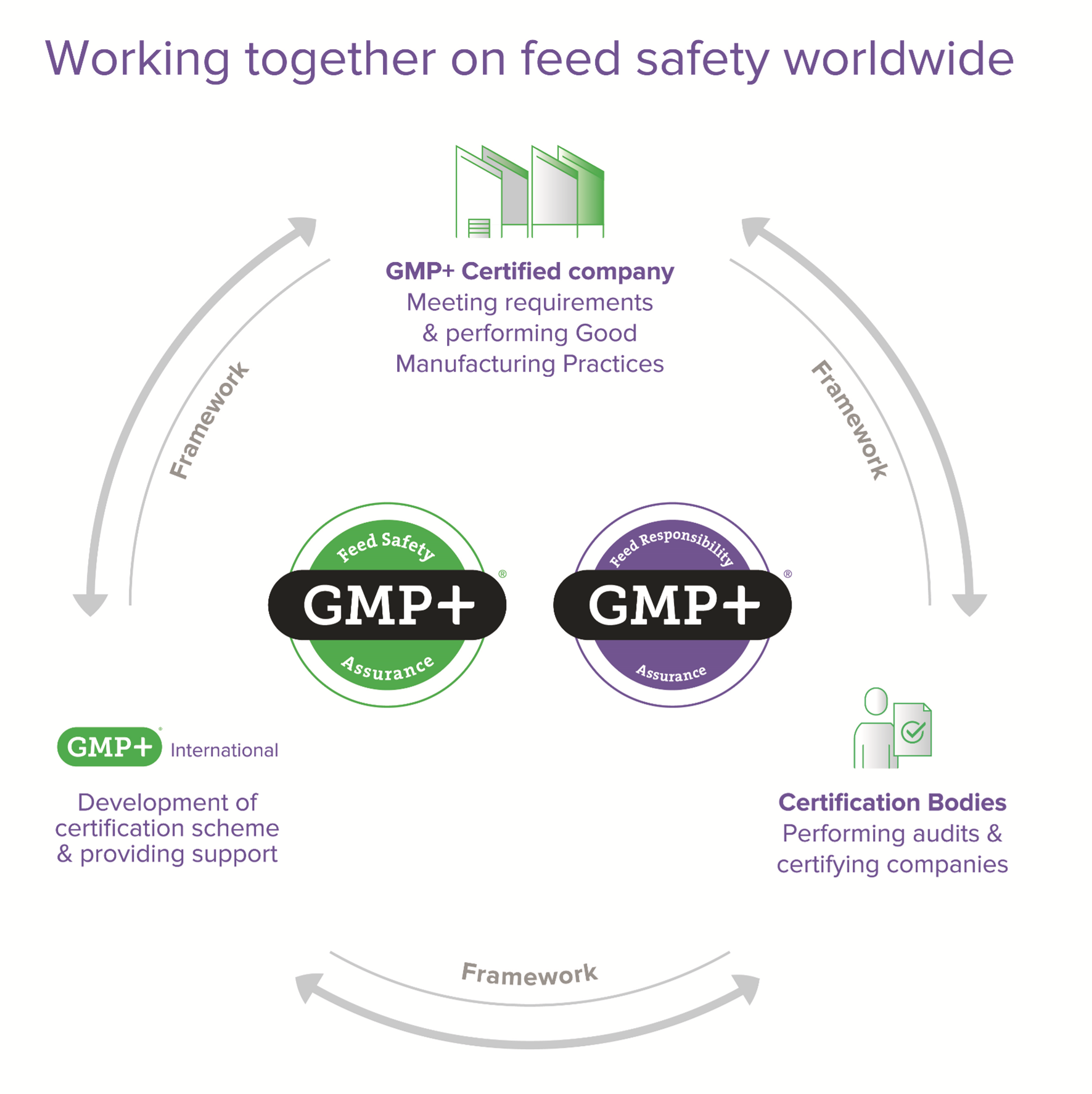 The GMP+ Feed Certification scheme ensures the same level of feed safety assurance worldwide. The requirements are objective, science-based and practical. The international accepted standards and requirements for feed safety assurance like GMP, HACCP, control measure for identified risks, ISO quality management requirements, traceability and corrective measures as described by EU legislation are leading. On the other hand, the GMP+ Feed Certification scheme ensures that companies can work responsible based on market initiatives.
